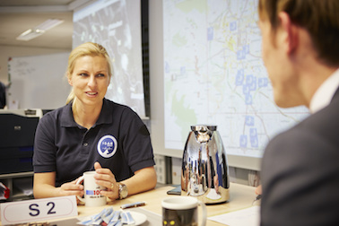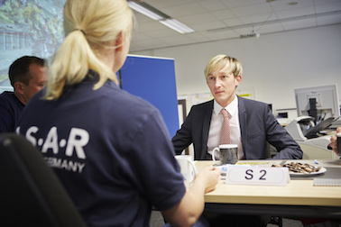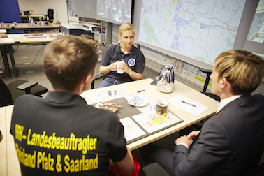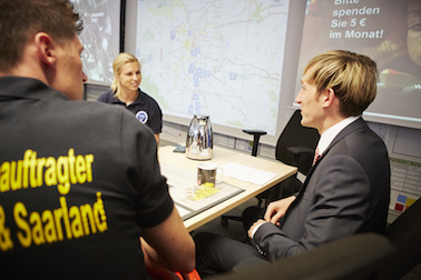 Im modernen und kostenlos bereitgestellten Lagezentrum der Duisburger Hauptfeuerwache, von dem aus der Einsatz in der Krisenregion in Nepal rund um die Uhr ehrenamtlich koordiniert wird, informierte die Präsidentin von I.S.A.R. Germany, Dr. Daniela Lesmeister, den Landtagsabgeordneten und dem Landesbeauftragten im BRH Bundesverband Rettungshunde e.V. für Rheinland-Pfalz und Saarland, Henri Paletta.